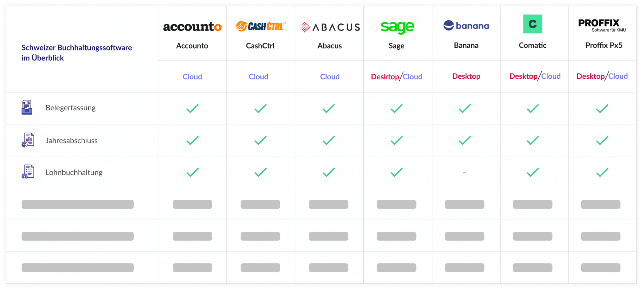 Seit der Veröffentlichung im Jahr 2020 haben wir diese Artikelserie jedes Jahr aktualisiert. Wir laden in wiederkehrenden Abständen alle bestehenden und potenziellen Anbieter von Schweizer Buchhaltungssoftware zur Teilnahme ein. Im Jahr 2025 berichteten uns die Partnerunternehmen Atlanto, MILKEE, Comatic AGDie Aktiengesellschaft (AG) ist eine der bekanntesten und am häufigsten genutzten Rechtsformen für Unternehmen. Sie wird insbesondere dann genutzt, wenn... Mehr, pebe und CashCtrl über ihre neu implementierten Optionen. Dieses Mal sind weitere Anbieter wie BillingEngine dazugestossen. Derzeit haben wir 21 Buchhaltungssoftware in unseren Artikeln verglichen.