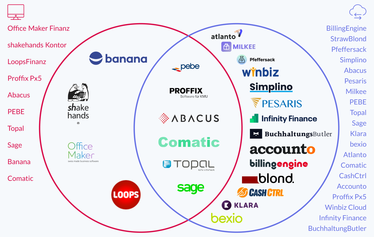 | Atlanto | Milkee | CashCtrl | Abacus | BillingEngine | Pfeffersack | Blond.swiss | Simplino | Comatic | pebeLive | shakehands Kontor | Pesaris | Infinity Finance | Accounto | Sage | Banana | Proffix Px5 | bexio | BuchhaltungsButler | Office Maker Finanz | LoopsFinanz | Winbiz Cloud | Topal | Klara | |