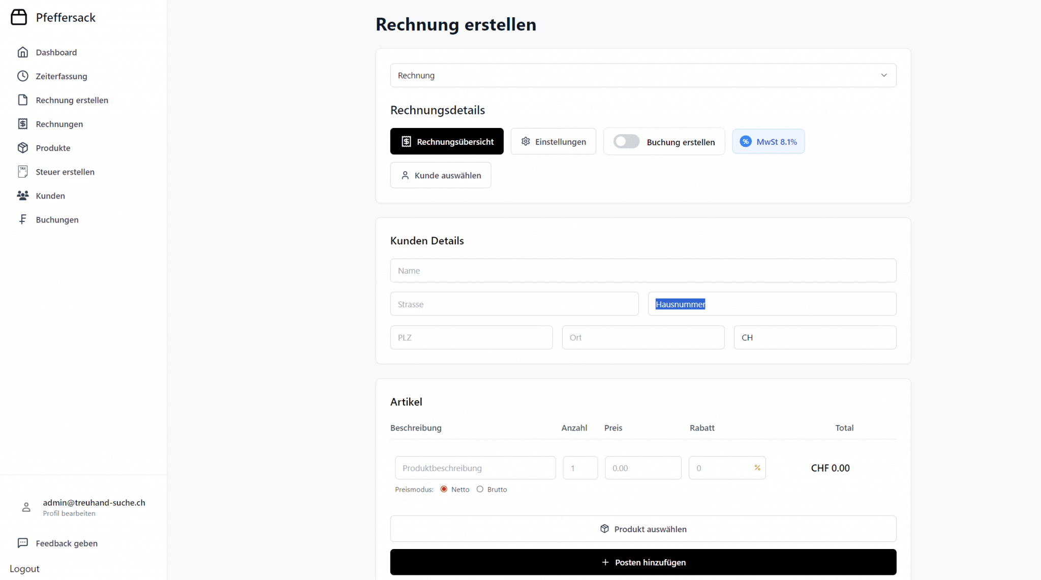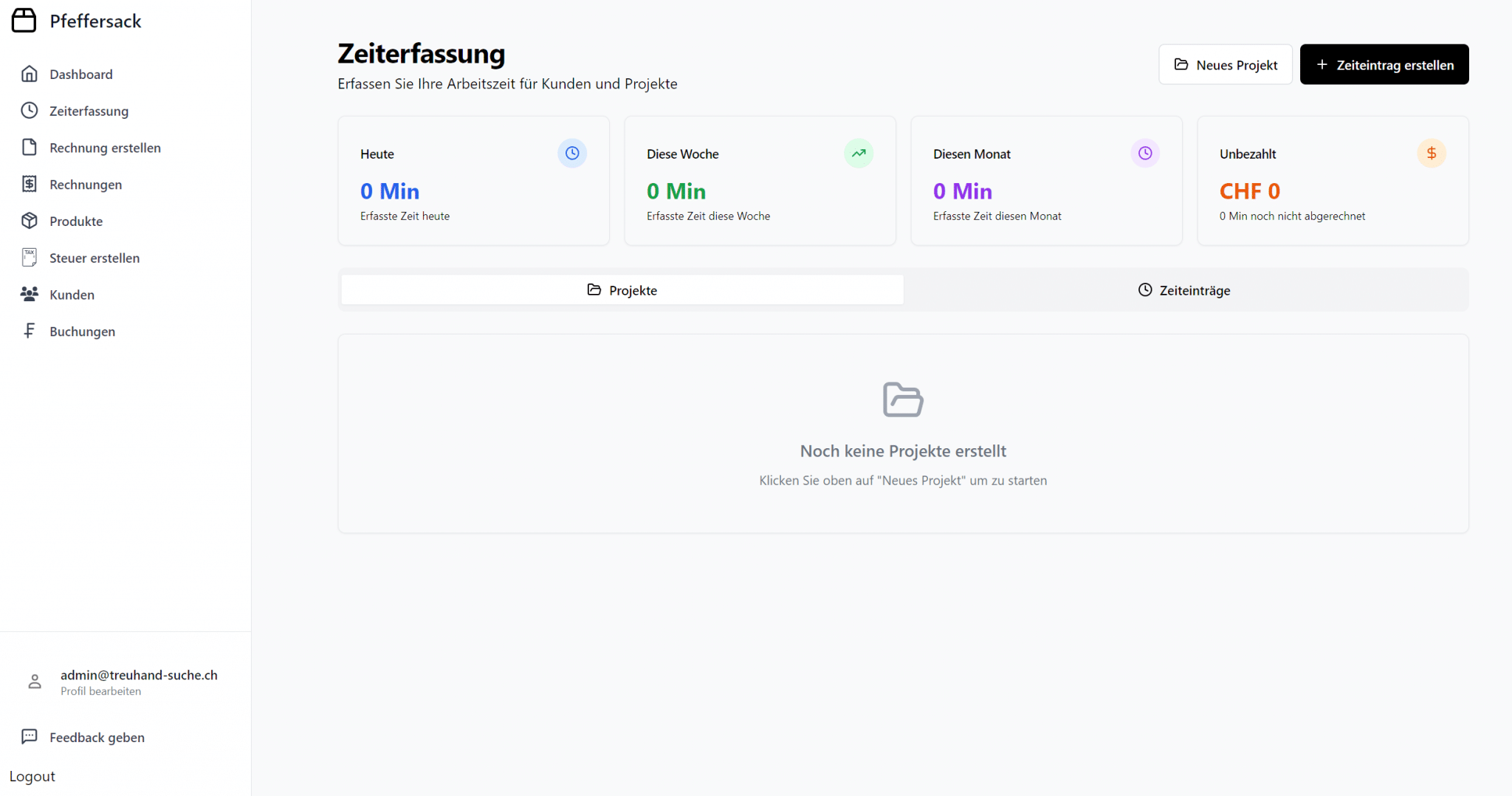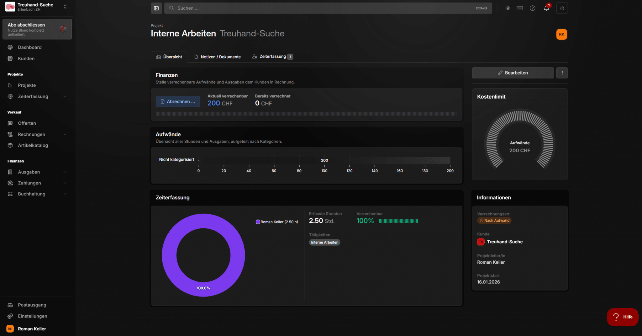 Direkt verfügbar sind eine Schaltfläche zur Zeiterfassung und ein Chat mit dem Support. Dort können Kontenrahmen, Kontaktinformationen, Benachrichtigungen und Tags geändert sowie ein Standardtemplate für Rechnungen und Offerten festgelegt werden.