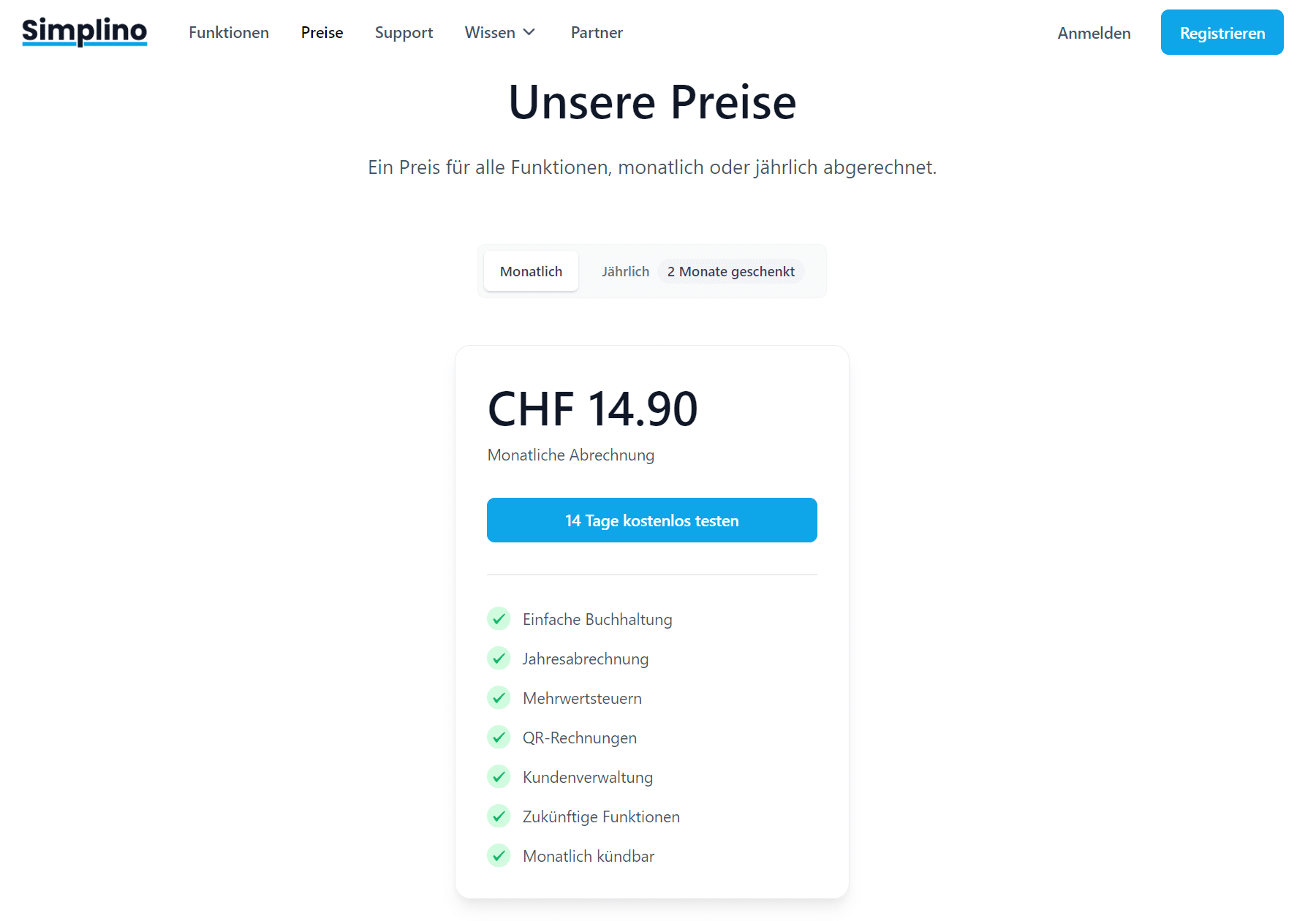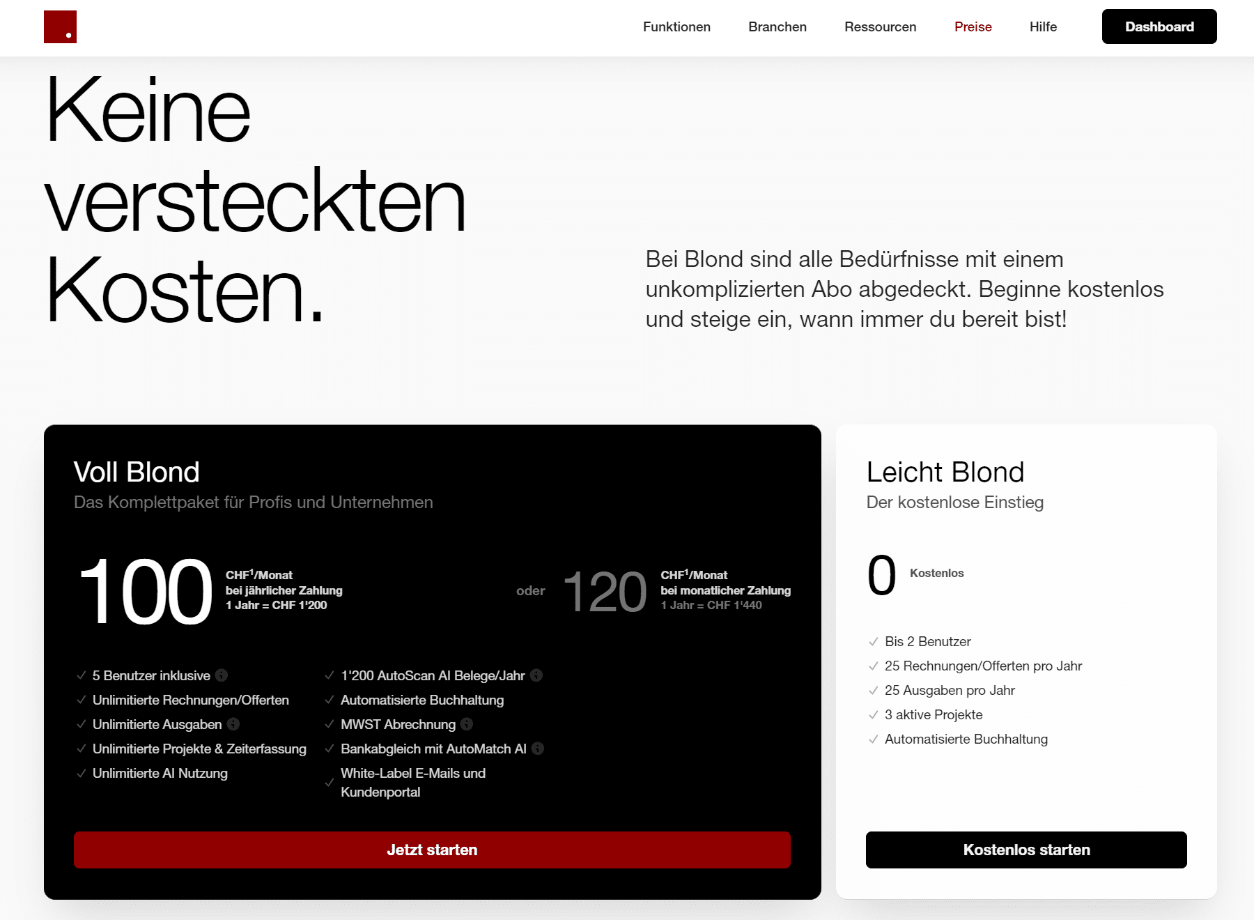 Starter (bis CHF 500K Jahresumsatz) – CHF 24.90 / Monat, Business – CHF 44.90 / Monat, Automate – CHF 59.90 / Monat.