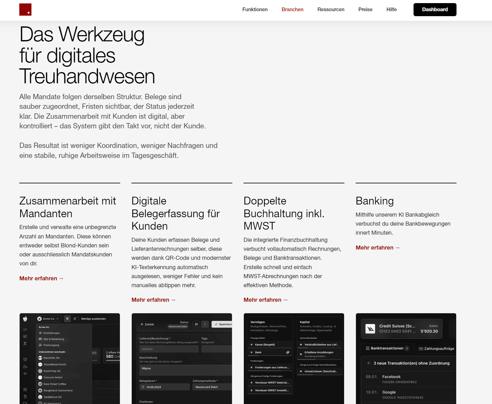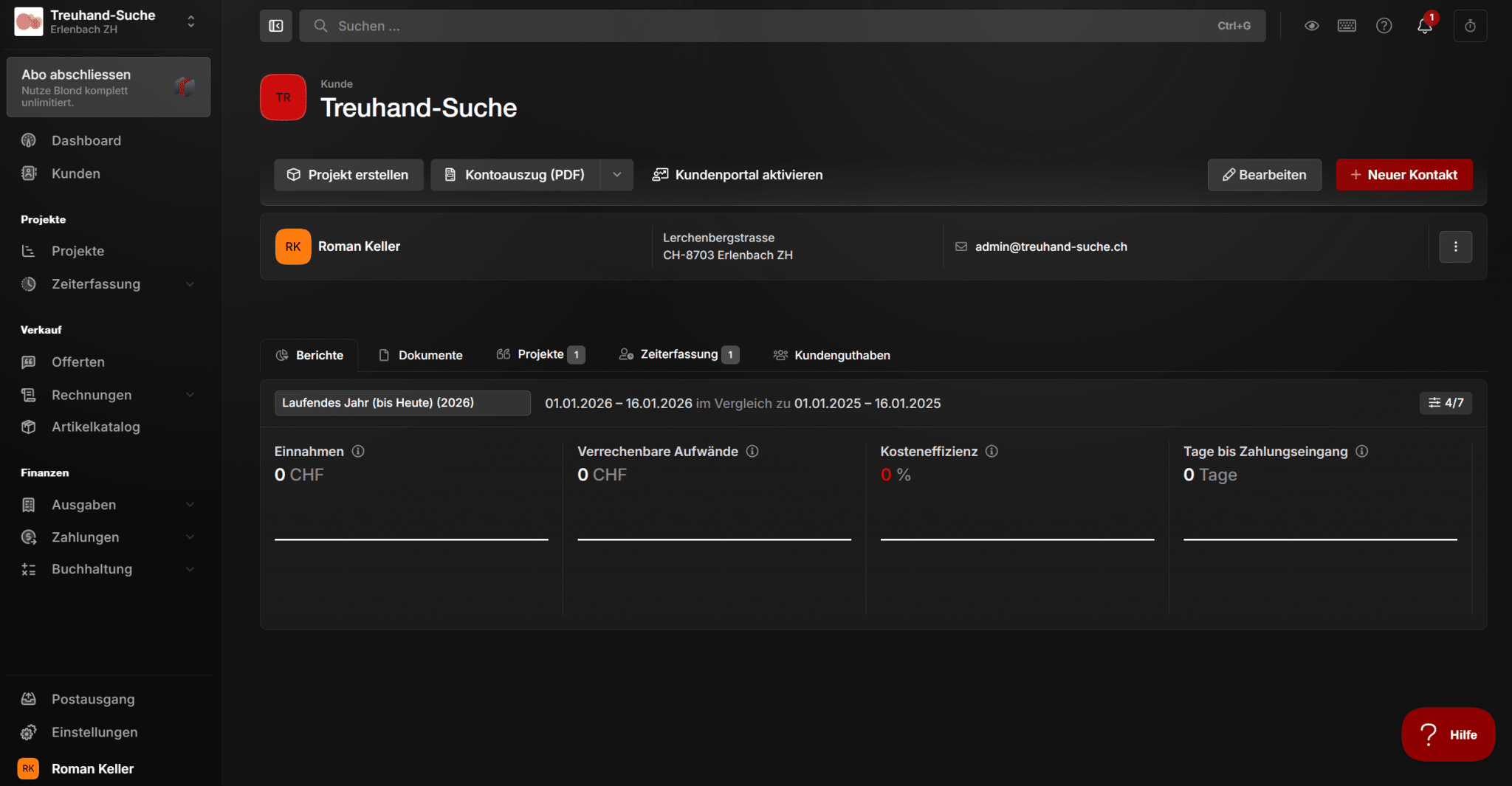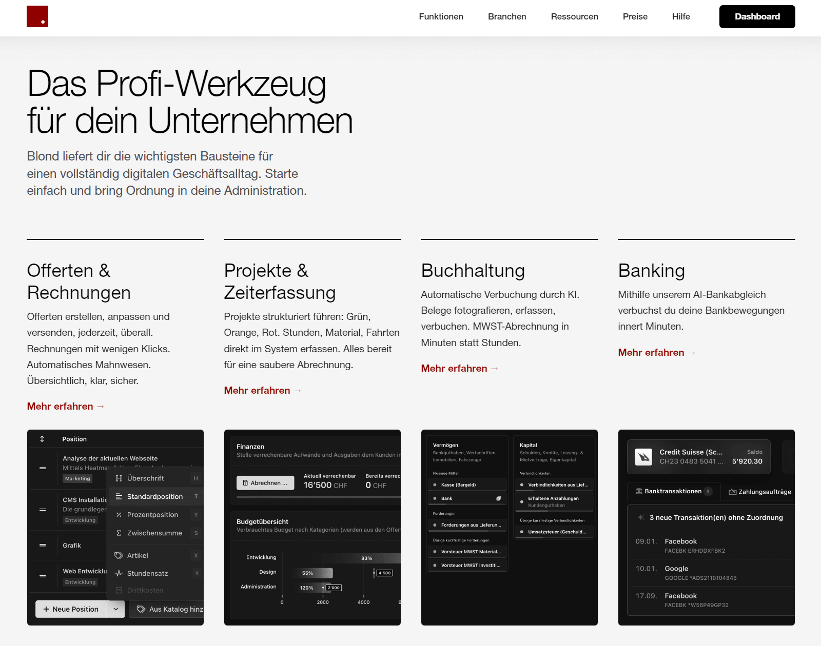 Durch die aktualisierte Liste haben wir Blond kennengelernt und getestet. Ein faszinierender Ansatz aus UI Perspektive. Wir haben es auch deshalb getestet, weil Bexio uns dann doch etwas enttäuscht hat. Wir arbeiten viel mit «Abrechnungsgutschriften» und Bexio bietet hier keine ideale Lösung für unsere Zwecke. Zudem können Gutschriften nicht über die API generiert werden. Allgemein gibt es bei der API Unterstützung wohl grosse Unterschiede zwischen den Anbietern – aber da wird es sehr technisch.